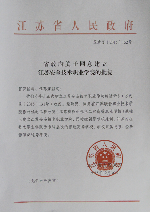 2015年12月30日,经江苏省人民政府批复同意,江苏安全技术职业学院正式建校。闻此喜讯,全校上下欢欣鼓舞,豪情满怀。