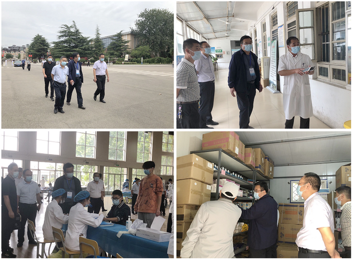 张兆成一行实地查看了学校门岗、学生宿舍、医务室、学生食堂、隔离点等重点场所,详细询问了防疫物资储备、场馆环境消杀等情况;还现场察看了2022级新生入校体检情况并给予了指导。