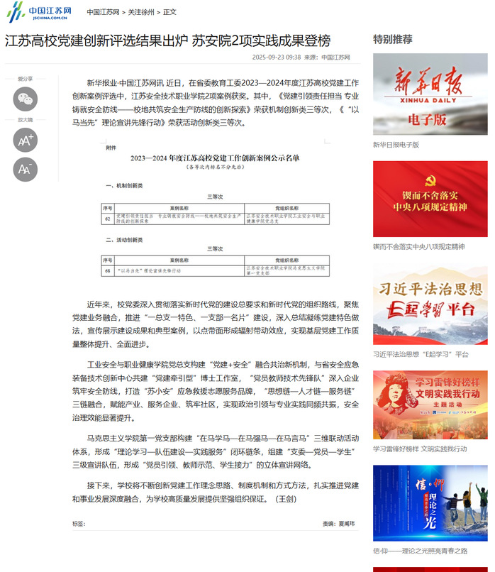 中国江苏网:江苏高校党建创新评选结果出炉 苏安院2项实践成果登榜