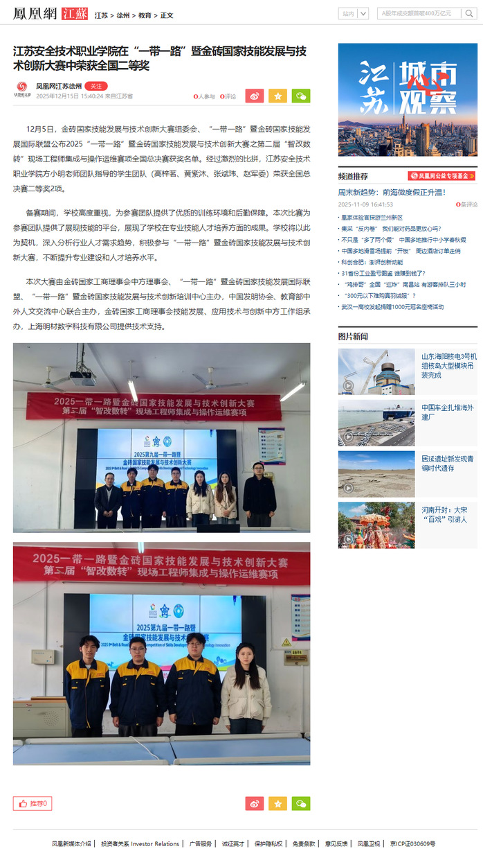 凤凰网江苏:江苏安全技术职业学院在“一带一路”暨金砖国家技能发展与技术创新大赛中荣获全国二等奖
