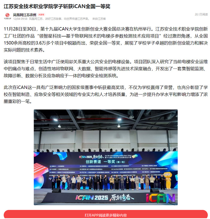 凤凰网江苏:江苏安全技术职业学院学子斩获iCAN全国一等奖