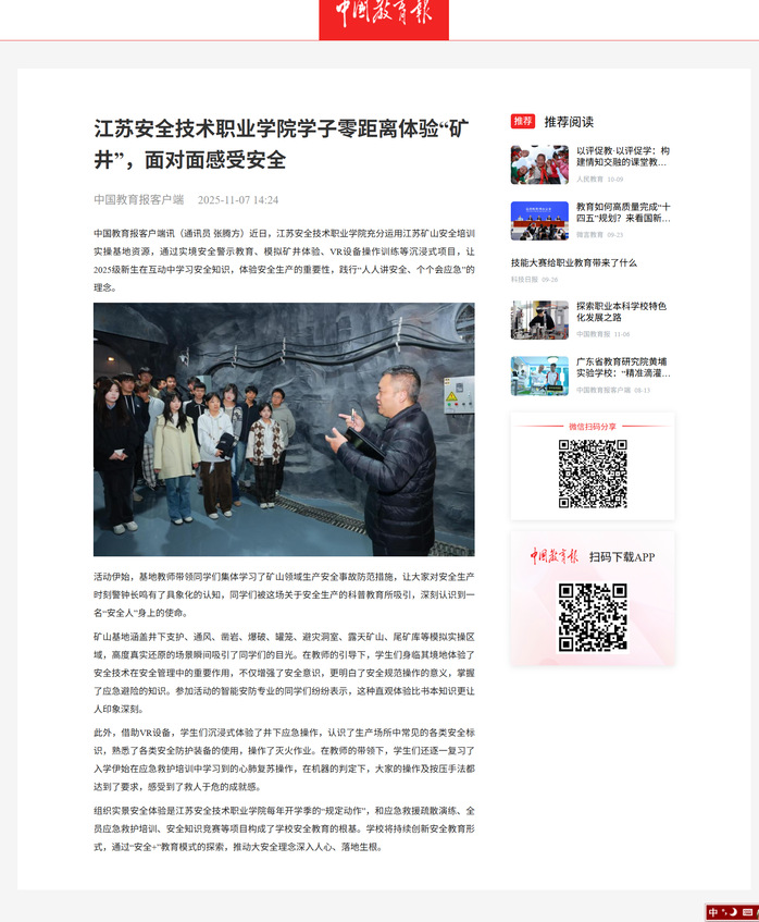 中国教育报客户端:江苏安全技术职业学院学子零距离体验“矿井”,面对面感受安全