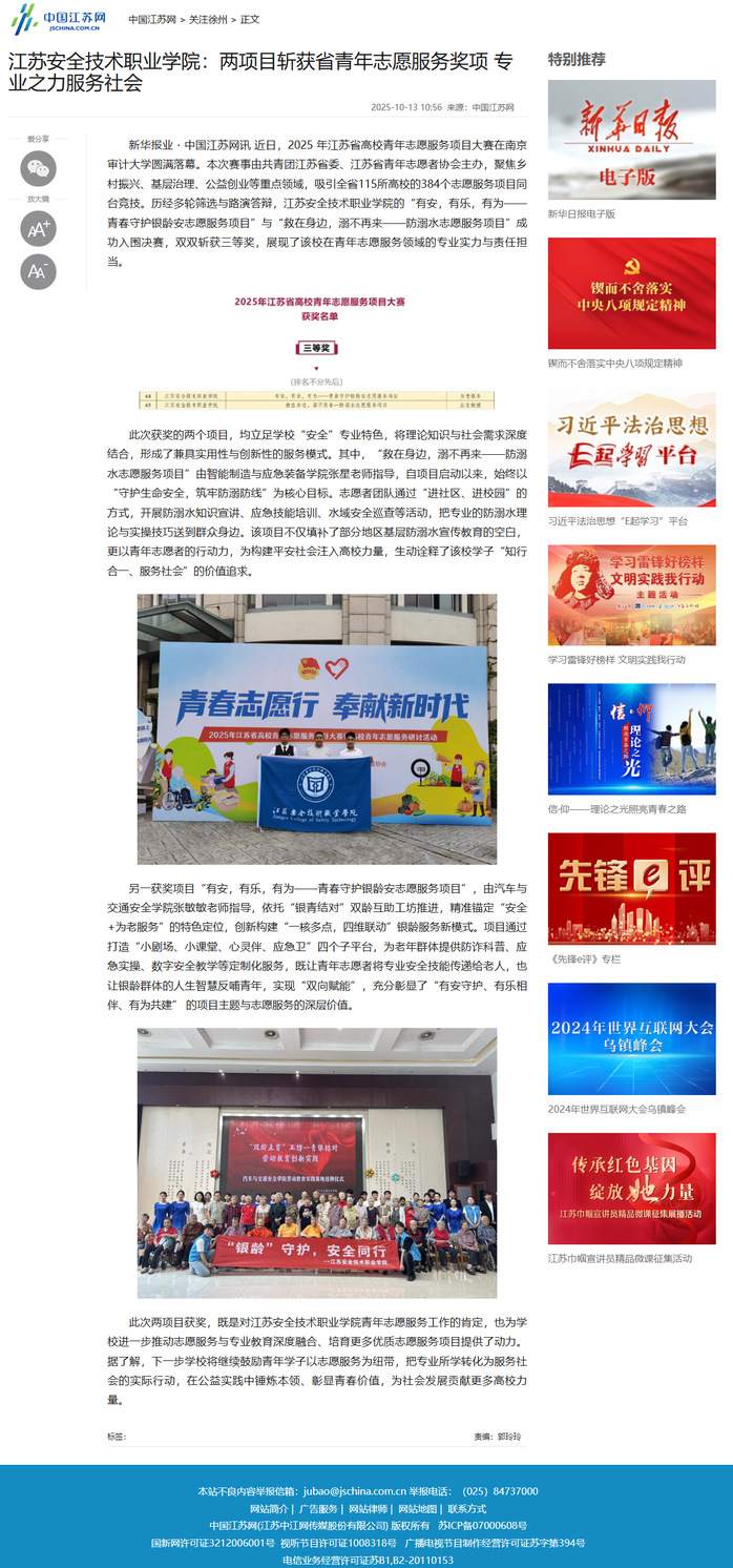 中国江苏网:江苏安全技术职业学院:两项目斩获省青年志愿服务奖项 专业之力服务社会