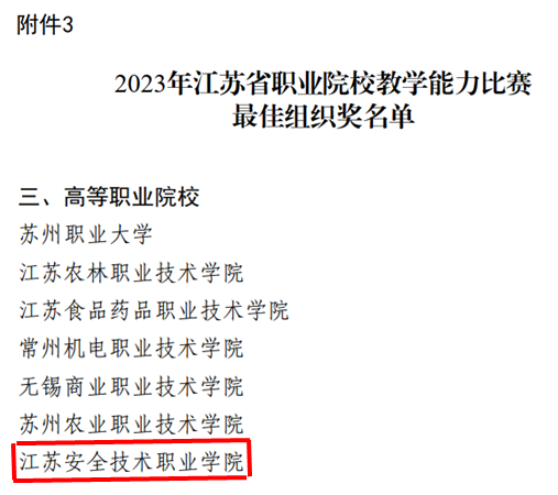 近日,根据《省教育厅等四部门关于公布2023年江苏省职业院校教学能力比赛获奖名单的通知》,我院荣获省职业院校教学能力比赛最佳组织奖,这是学院参赛以来第三次荣获该项荣誉。