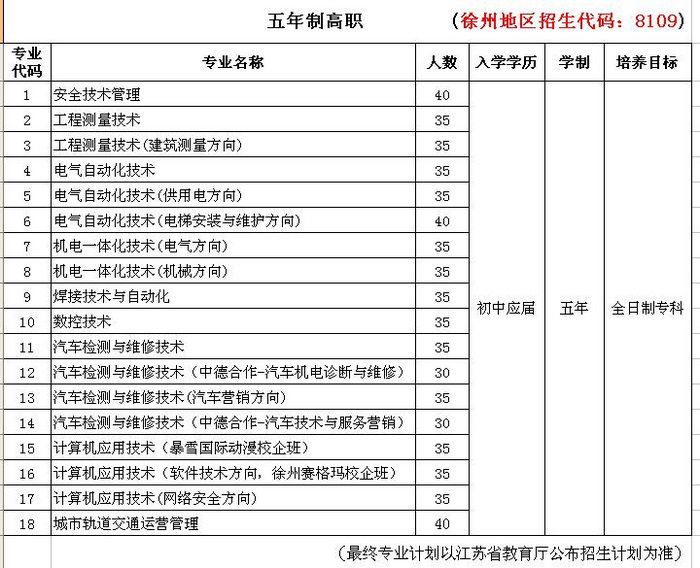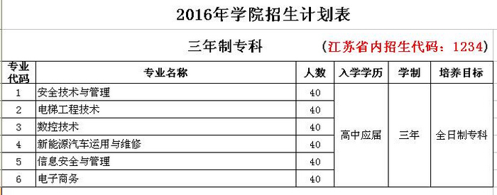 首批纳入我院2016年招生的六个三年制专科专业为:安全技术与管理、电梯工程技术、数控技术、新能源汽车运用与维修、信息安全与管理、电子商务;18个五年制高职专业为:安全技术管理、工程测量技术、工程测量技术(建筑测量方向)、电气自动化技术、电气自动化技术(供用电方向)、电气自动化技术(电梯安装与维护方向)、机电一体化技术(电气方向)、机电一体化技术(机械方向)、焊接技术与自动化、数控技术、汽车检测与维修、汽车检测与维修(中德合作-汽车机电诊断与维修)、汽车检测与维修(汽车营销方向)、汽车检测与维修(中德合作-汽车技术与服务营销)、计算机应用技术(暴雪国际动漫校企班)、计算机应用技术(软件技术方向,徐州赛格玛校企班)、计算机应用技术(网络安全方向)、城市轨道交通运营管理。