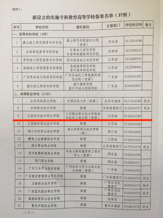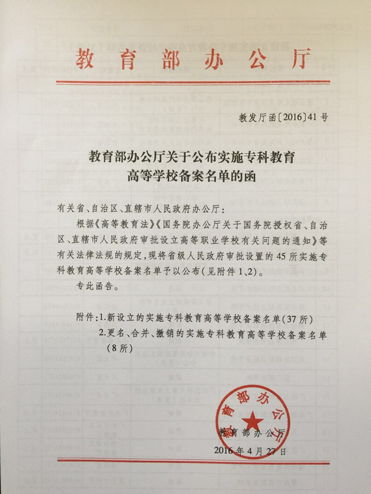 近日,教育部办公厅下发《关于公布实施专科教育高等学校备案名单的函》 (教发厅函〔2016〕41号),江苏安全技术职业学院已列入教育部同意备案新设立的高等学校,顺利通过教育部正式备案,这标志着学院已正式列入专科层次的全日制普通高校行列。