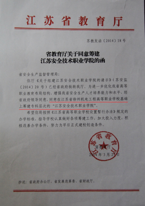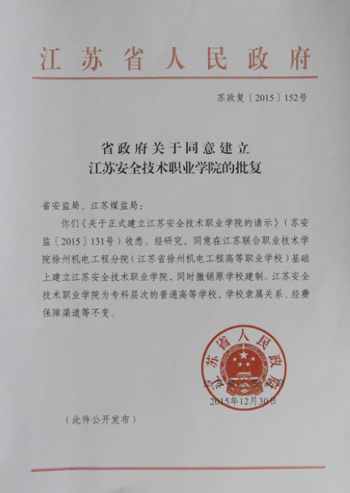 2014年3月27日经江苏省教育厅批准,同意在江苏省徐州机电工程高等职业学校基础上筹建专科层次的“江苏安全技术职业学院”。2015年12月30日经江苏省人民政府批复同意建院,2016年3月报教育部备案,4月底备案成功通过。由此,我院高职院创建工作所有程序全部完成,正式跨入专科层次普通高等学校序列,2016年江苏安全技术职业学院面向社会招收高中起点三年制高职大专学生和初中起点五年制高职大专学生。