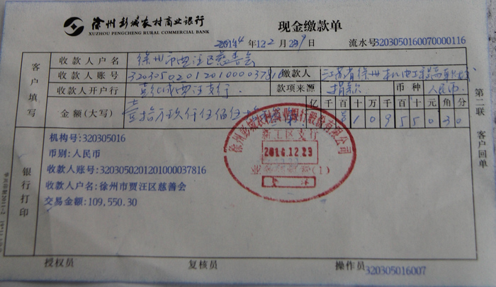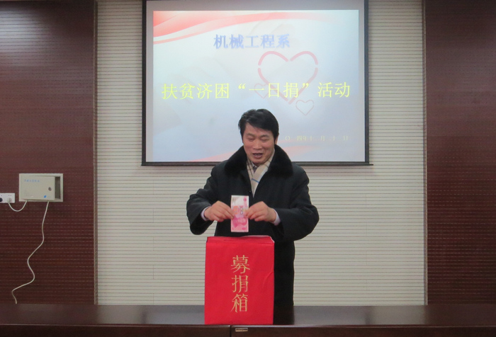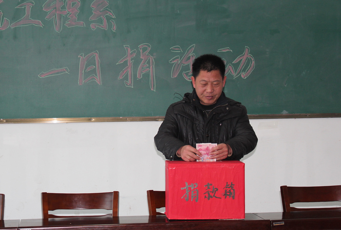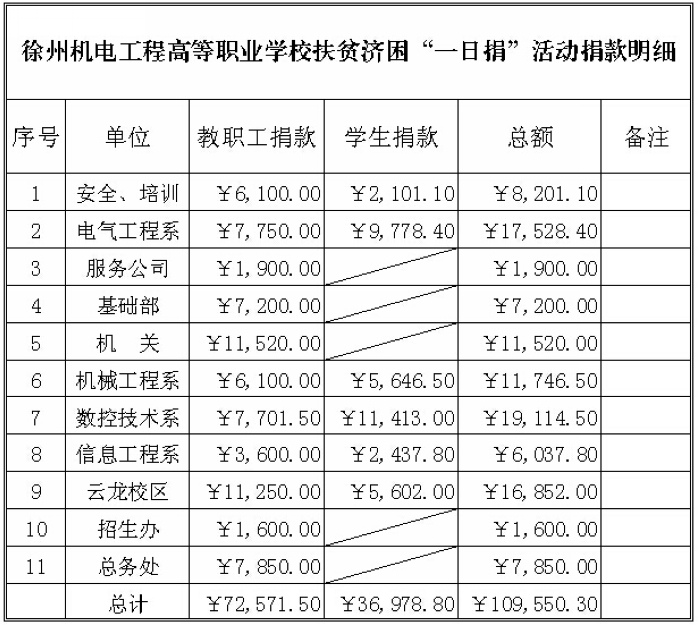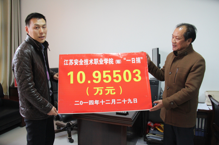 学校号召全体教职工捐出一天的工资,学生捐出一天的零花钱。活动通知发出后,各单位认真组织,广泛宣传,积极发动。广大师生积极响应学校号召,踊跃参与,共募得善款109550.30元。12月29日,贾汪区民政局举行捐赠仪式,校工会主席陈忠华代表学校将募集善款捐赠给贾汪区民政局。据悉,募集善款将全部用于城乡扶贫济困,低保等困难家庭的救助,助医、助老、助孤、助学和慈善超市等专项救助。
