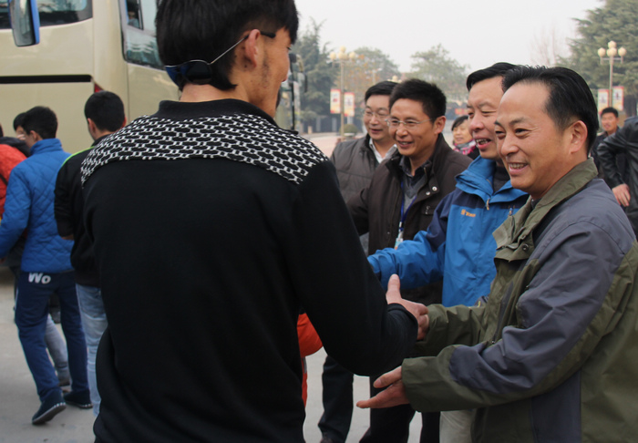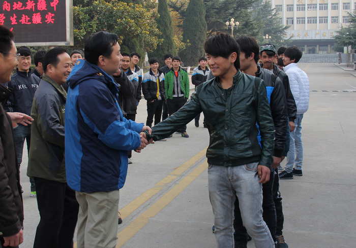 元月4日下午,我校新疆中职班56名学子在校办公楼前整装待发。学校自有的两辆大客缓缓停在学子队列前。