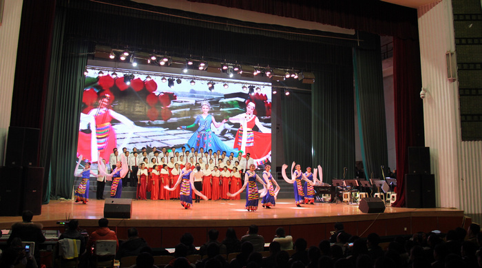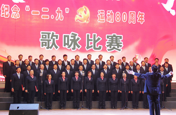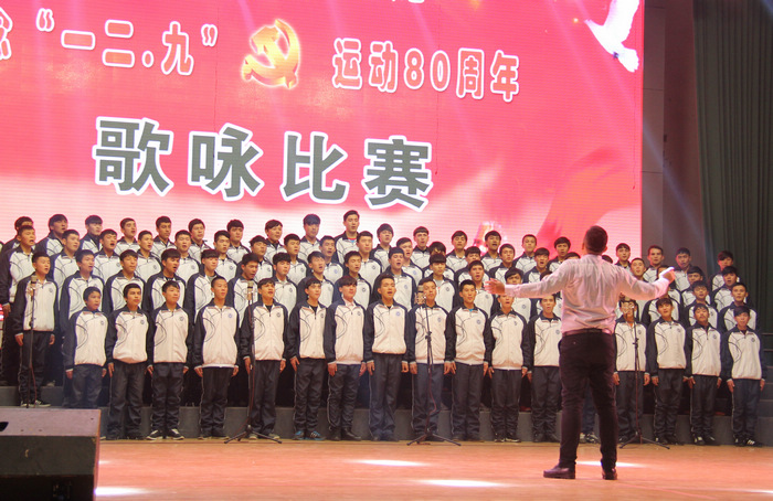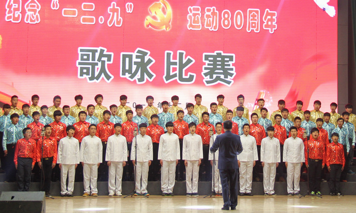 12月9日下午和晚上,学校文化中心歌声嘹亮,千名师生齐聚一堂,以饱满的热情隆重纪念“一二•九”运动80周年。校园电视台通过直播系统对活动进行现场直播,六千余名师生在教室收看了歌咏比赛。