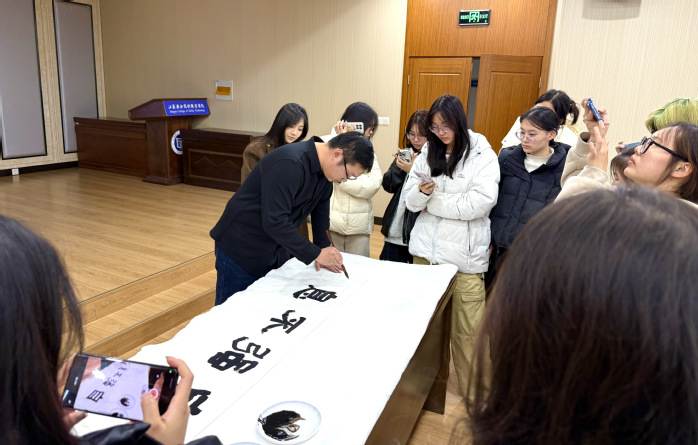 张禹首先从中国书法的历史源流谈起,深入浅出地阐述了字体的演变,并讲解了书法艺术中蕴含的哲学思想。他谈到,书法不仅是笔墨技巧的展示,更是书写者性情、修养的外化。他鼓励同学们在学习书法的过程中,要“以古为师,守正创新”,在临摹经典作品的同时,要融入自己对作品的理解。在随后的现场示范环节,他展纸挥毫,挥洒写就“自强不息”四个大字。简单的四个大字不仅展示了老师深厚的功底,同时也是对学生们寄予厚望,愿同学们自强不息、奋发图强。