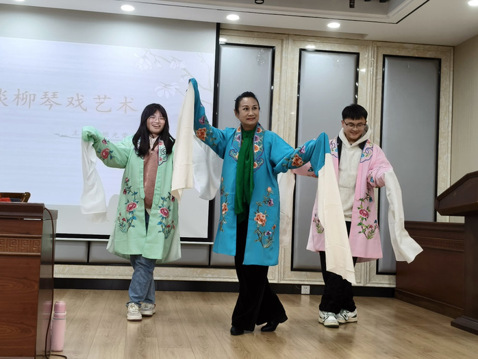 讲座中,姬光荣老师结合四十余年艺术生涯,从柳琴戏的历史渊源、文化内涵与艺术特色展开分享。她介绍到,柳琴戏作为流传百年的江苏地方戏曲,承载着丰富的地域文化与民俗风情,经过几代艺术家的传承创新,已成为兼具传统韵味与时代活力的非遗瑰宝。姬老师还现场展示了柳琴戏经典片段,精美的戏曲服饰、婉转的唱腔与灵动的身段,让同学们直观感受传统艺术的独特魅力。互动环节中,她邀请学子上台体验,手把手指导基本唱腔与动作,帮助大家近距离领略戏曲表演的细节与情感表达。