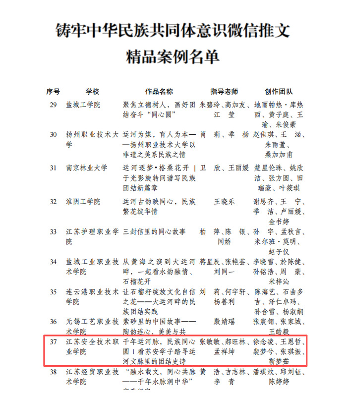 近日,省民宗委、省委宣传部、省委统战部、省教育厅开展的全省第三届“铸牢中华民族共同体意识·高校在行动”系列活动精品案例评选结果公布,我校汽车与交通安全学院徐念凌团队在张敏敏、郝旺林、孟祥坤老师指导下创作的《千年运河脉,民族同心圆|看苏安学子踏寻运河文脉里的团结史诗》入选。