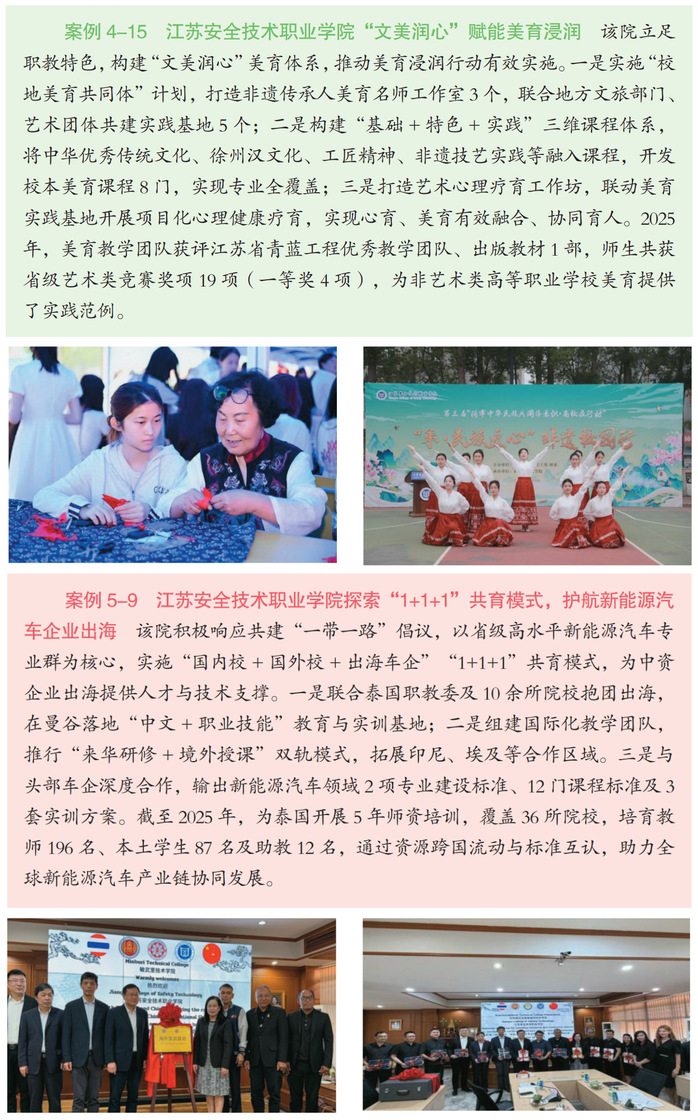 本次入选案例之一为《江苏安全技术职业学院“文美润心”赋能美育浸润》,展示了学校构建“文美润心”美育体系,推动美育浸润行动有效实施,为非艺术类职业院校美育提供范例的实践经验;入选案例之二为《江苏安全技术职业学院探索“1+1+1”共育模式,护航新能源汽车企业出海》,展示了学校以省级高水平新能源汽车专业群为核心,实施“国内校+国外校+出海车企”共育模式,为中资企业出海提供人才与技术支撑的有效做法。