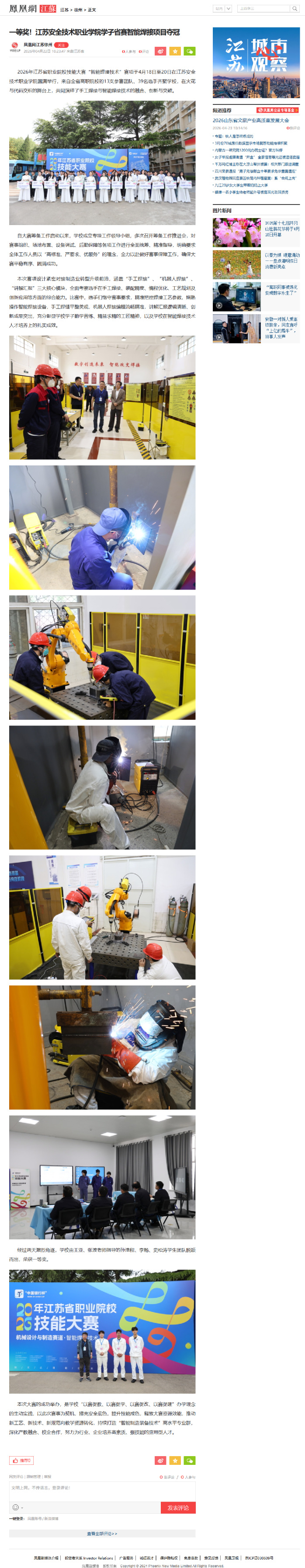 凤凰网江苏:一等奖!江苏安全技术职业学院学子省赛智能焊接项目夺冠