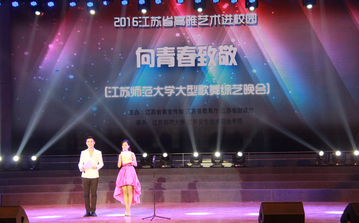为引领全院师生更好的汲取优秀文化艺术精粹,引领青年学子提高审美和人文素养,9月13日,我院党委宣传部牵头与江苏师范大学联合承办的2016江苏省高雅艺术进校园“向青春致敬”大型歌舞综艺演出在贾汪校区文化中心精彩上演。