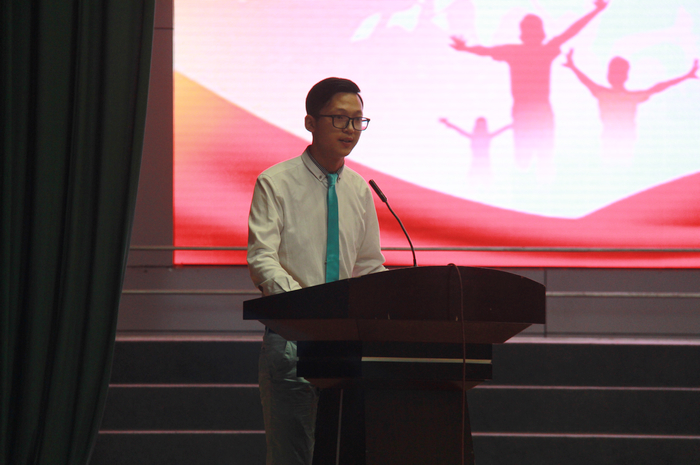 伴随着庄严的中华人民共和国国歌,新生开学典礼正式开始。青年教师代表刘麟做了发言。刘老师代表教师们庄严地承诺:将一如既往地尽忠于教育事业,认认真真上课,踏踏实实工作,教好书,育好人。老生代表安全工程系学生会副主席梅佳鹏在发言中表示会努力学习专业知识,提升技能,攀登科学知识的高峰,勇于开拓,不断提高自身素质,做一个思想品德高尚、专业知识扎实、技能熟练的优秀人才。新生代表2016级电子商务一班辛培钰同学说,新生们将努力适应校园新生活,勤奋学习,用梦想与坚持在新的起点上踏上新征程。