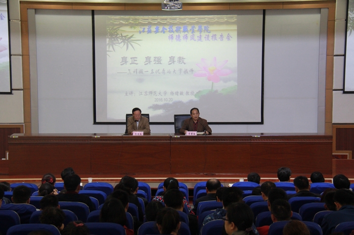 为进一步加强学院师德师风建设,提升教师职业道德素养。10月20日,我院邀请江苏师范大学杨绪敏教授为全院教师作师德师风专题讲座。讲座由党委宣传部于孝忠部长主持。