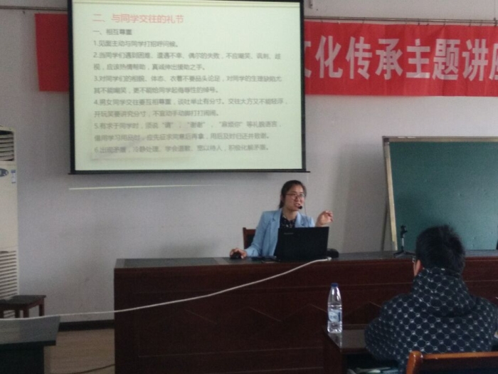 李晓老师从传承中华优秀传统文化的重要意义、优秀传统案例和生活实际入手,阐释了传统文化在国家发展过程中的作用,从中华民族之所以几千年屹立于世界民族之林,历经磨难,一次次凤凰涅槃,成为人类发展史上的奇观,最根本的归因就是深深植根于民族基因的伟大精神支撑和崇高价值追求。讲座从中国传统文化中的礼仪文化,联想到同学们在校园里的言行表现,深入浅出,旁征博引,不时引起阵阵掌声。