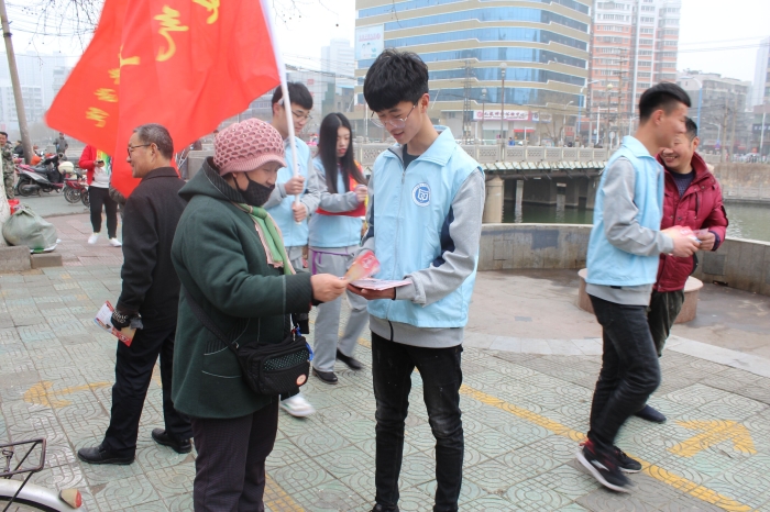 电气工程系组织志愿者在故黄河畔向市民发放雷锋精神宣传册,讲述雷锋事迹,演唱学雷锋歌曲。