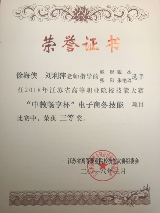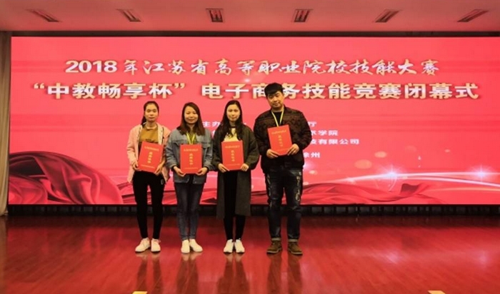 3月25日,江苏省高等职业院校技能大赛“中教畅享杯”电子商务技能竞赛在徐州工业职业技术学院拉开帷幕;共有来自全省高职院校56支代表队224名参赛选手参加比赛。信息工程系徐海侠、刘利萍两位老师指导的电子商务专业张阳、朱艳玲、张杰、魏彤4位同学,经过长达8小时的激烈比赛,完成客户服务、网店开设装修、运营推广三个模块的比赛任务,取得优异成绩,荣获三等奖。