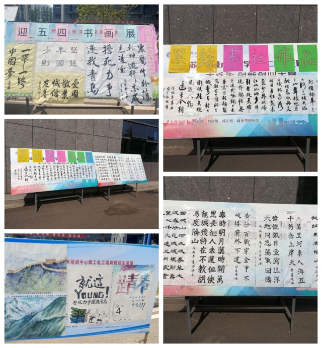 云龙校区安全系和电气系开展“迎五四,墨缘书法社团作品展”、“迎五四书画展”活动,以中国传统文化的形式宣扬五四精神。