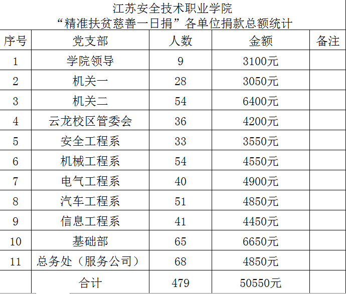 9月7日上午,学院党委专门研究部署“慈善一日捐”工作,全体党员干部职工积极参与,纷纷慷慨解囊,以实际行动去帮助困难群众,共募集善款50550元。所募集善款已于9月10日上午汇至省局机关委员会。