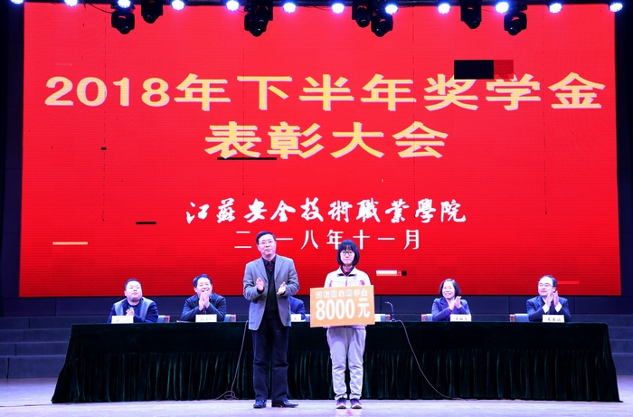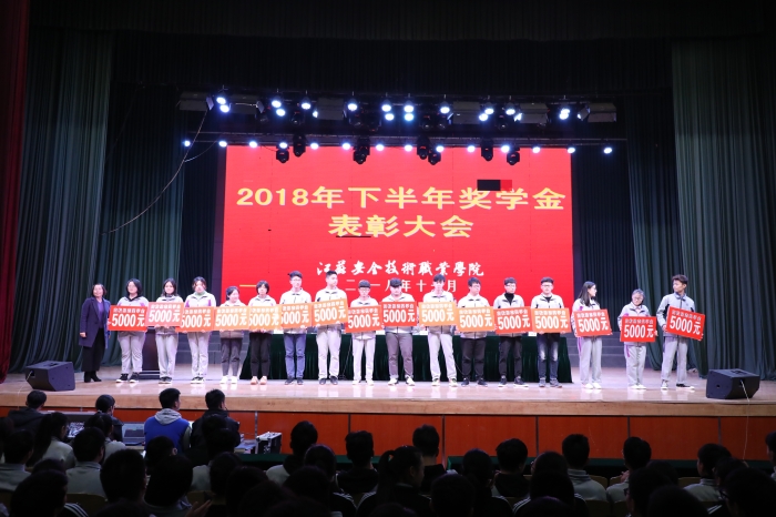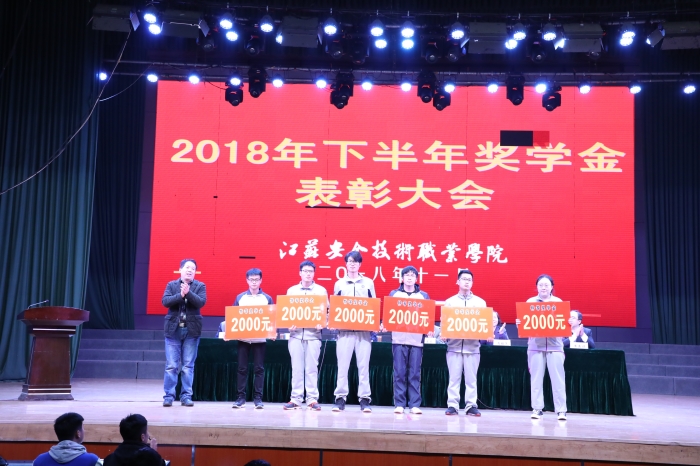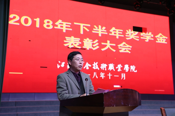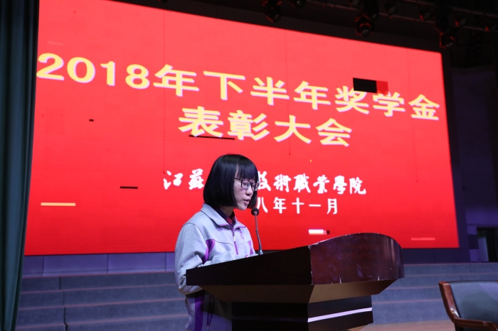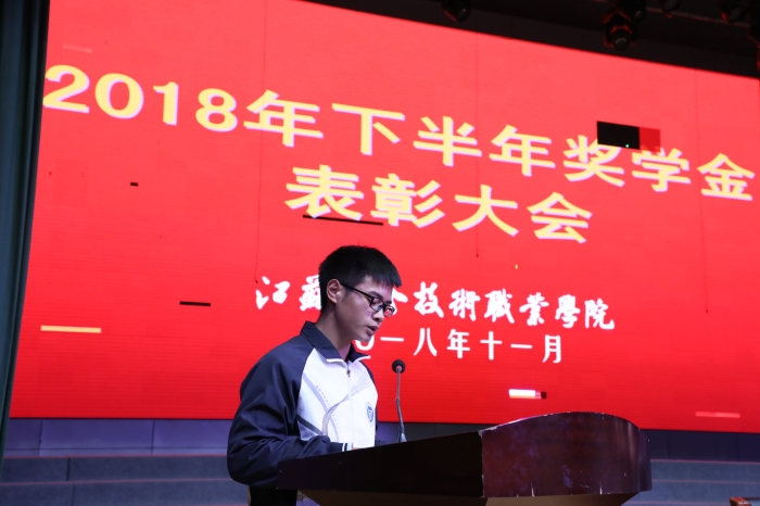 会上,教务处处长杜宗辉宣读了《2017~2018学年第二学期奖学金表彰决定》,此次我院评选出1079名学生获得校内奖学金。学工处处长黄清站宣读了《关于公布2018年度国家奖学金、国家励志奖学金获得者名单的通知》,本年度我院评选出国家奖学金1名,国家励志奖学金71名,国家助学金588名。本次表彰大会共计奖励人数1739人。国家奖学金获得者16大专信息安全技术与管理班的田君慧子同学以及特等奖学金代表15高职机电一体化技术2班的卓炳博同学做了交流发言。他们首先感谢党和国家的资助关怀以及学院领导和教师的殷切期盼,然后简要总结了入校几年来的点滴收获与感悟,最后倡议广大同学们要不断坚定政治信仰,树立崇高的理想信念,学会做人,学会做事,学会学习,为自己的学习目标和美好明天而努力奋斗。