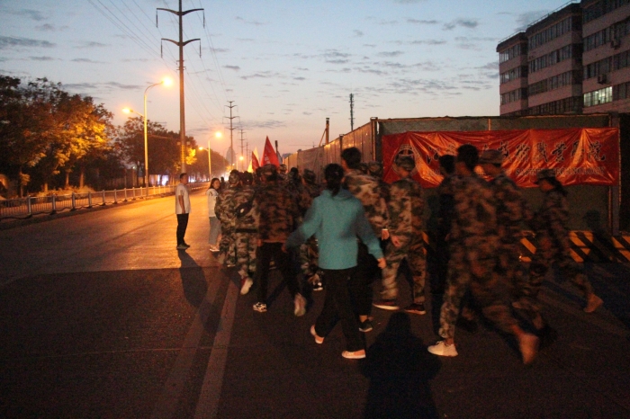5:00时整,伴着哨声,全体2019级新生身穿迷彩服,迅速在喷泉广场集合,全体参训学生在教官的带领下,从学校出发,开始了将近2个小时的军训拉练活动。