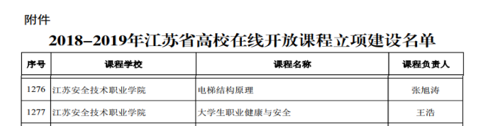 近日,江苏省教育厅传来喜讯,由我院教师王浩、张旭涛分别负责的《大学生职业健康与安全》《电梯结构原理》两门在线开放课程,予以立项建设。