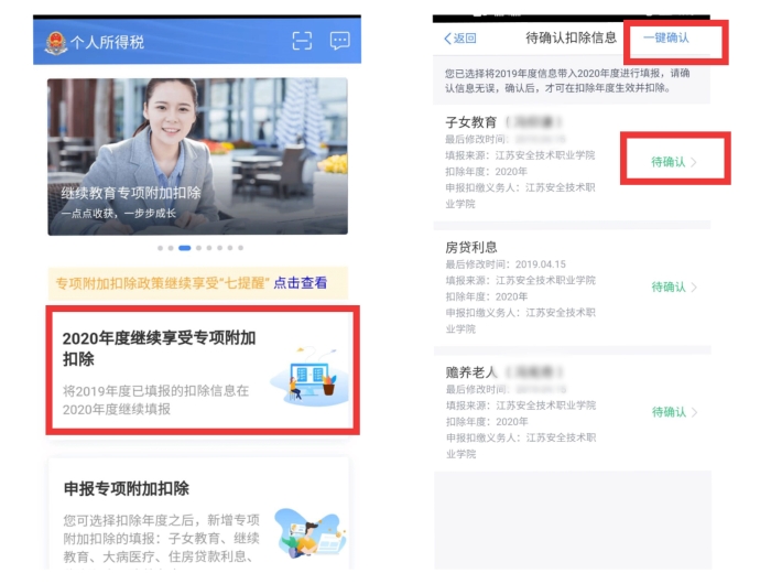 1. 2019年度已申报教职工:打开“个人所得税”APP,更新到最新版本,在首页点击“2020年度继续享受专项附加扣除”,核对“待确认”信息,可以点击修改,也可以“一键确认”。