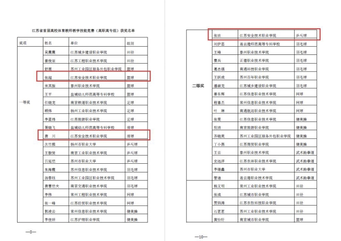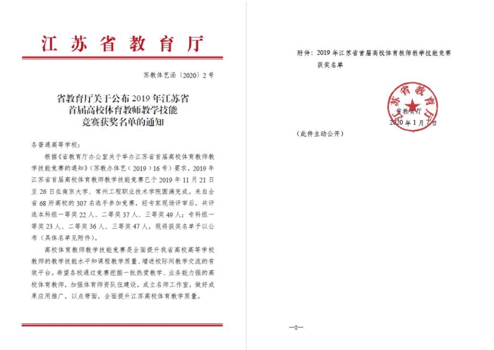 近日,江苏省教育厅文件(苏教体艺函〔2020〕2号)公布了2019年江苏省首届高校体育教师教学技能竞赛获奖名单,此次比赛已于2019年11月21日至26日在南京大学、常州工程职业技术学院圆满完成。来自全省68所高校的307名选手参加竞赛,经专家现场评审后,共评选本科组一等奖22人、二等奖37人、三等奖49人;专科组一等奖23人、二等奖36人、三等奖47人。