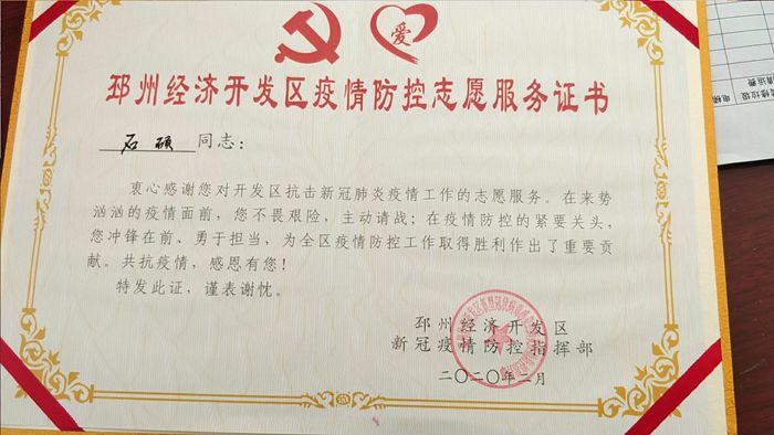 石硕是16高职数控5-1班的学生。在新冠肺炎疫情突发、地方组织防疫工作困难的紧要关头,作为一名退伍军人和在校大学生,他积极响应国家号召,主动请缨成为街道社区一名疫情防控工作志愿者。石硕始不计个人得失,每日奔波于刘庄村村口的疫情防控卡口和刘庄村拆迁安置房锦绣江南小区的疫情防控卡口,对外来车辆进行登记,为出入的居民量体温、分发防控宣传资料、告知疫情防控注意事项等。疫情就是命令,防控就是责任。