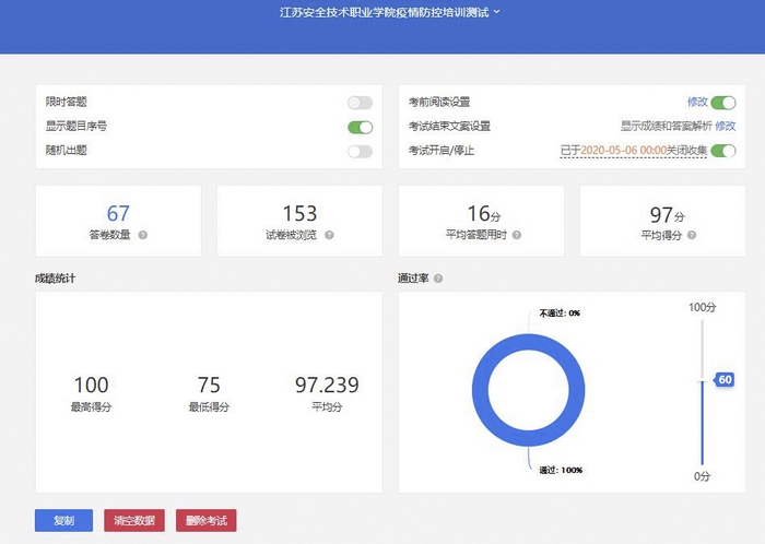 为提高全院教职员工的自我防护能力,强化学院疫情防控专业化水平,充分做好开学复课工作准备,学院近期组织开展了疫情防控培训,并于5月5日对中层以上领导干部进行了线上测试。
