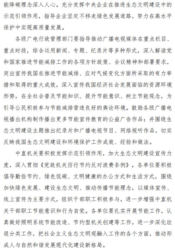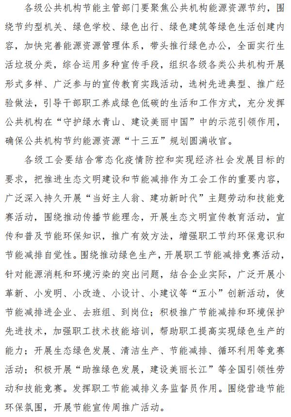 二、节能宣传周期间,国家发展改革委将会同有关单位围绕宣传主题,组织开展“云”上节能周相关宣传活动,提升全社会节能意识和节能能力,提高能源资源利用效率,持续推进生态文明建设。各部门、各地区要围绕宣传重点,组织动员社会各界积极参与,普及生态文明、绿色发展、节能降耗理念和知识,加快形成绿色生产生活方式。要通过群众喜闻乐见的宣传形式,广泛动员全社会参与节能降耗。积极运用网站及微信、微博、视频平台等新兴媒体,充分发挥电视、广播、报纸等传统媒体优势,加大宣传力度。加强与网络、通讯、交通、城管等部门的衔接,妥善做好相关宣传材料的推送、发布、播放及张贴工作。要结合工作实际开展具有地方特色的宣传活动。