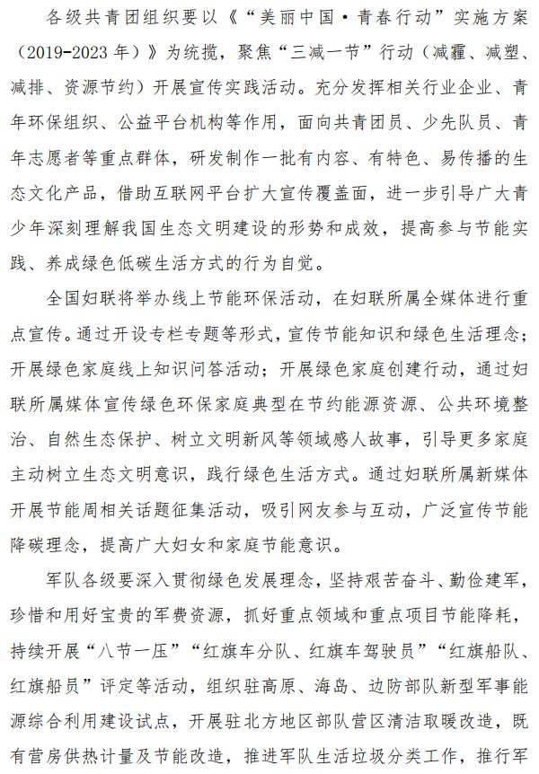 中直管理局,国务院有关部门,中央军委后勤保障部,全国妇联,有关社会团体,各省、自治区、直辖市及计划单列市、副省级省会城市、新疆生产建设兵团发展改革委、生态环境厅(局)、教育厅(教委、教育局)、科技厅(科委、科技局)、工业和信息化主管部门、住房和城乡建设厅(建委、建设交通委、建设局)、交通运输厅(局、委)、农业农村(农牧)厅(局、委)、商务主管部门、国资委、广电局、机关事务管理部门、总工会、团委,山西省能源局: