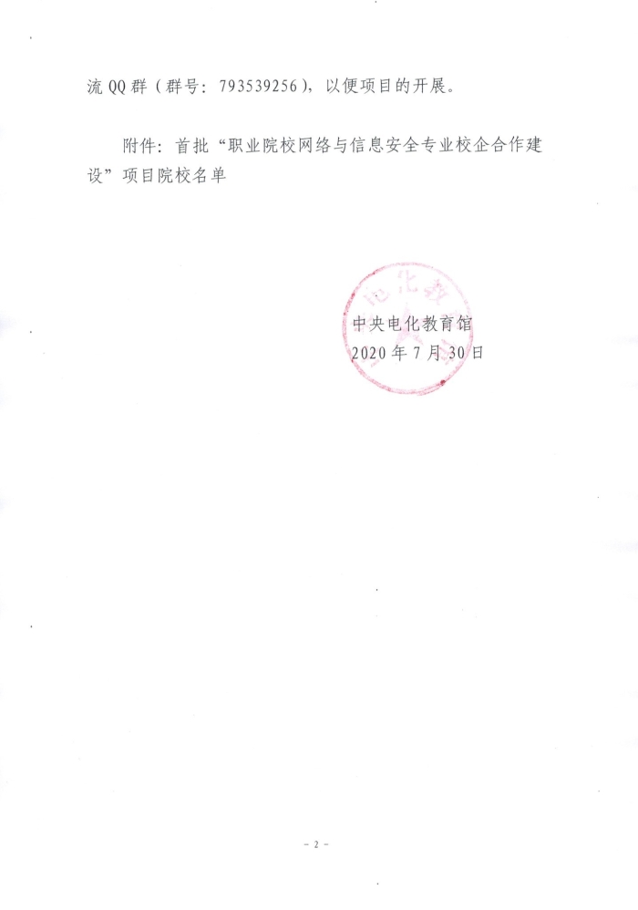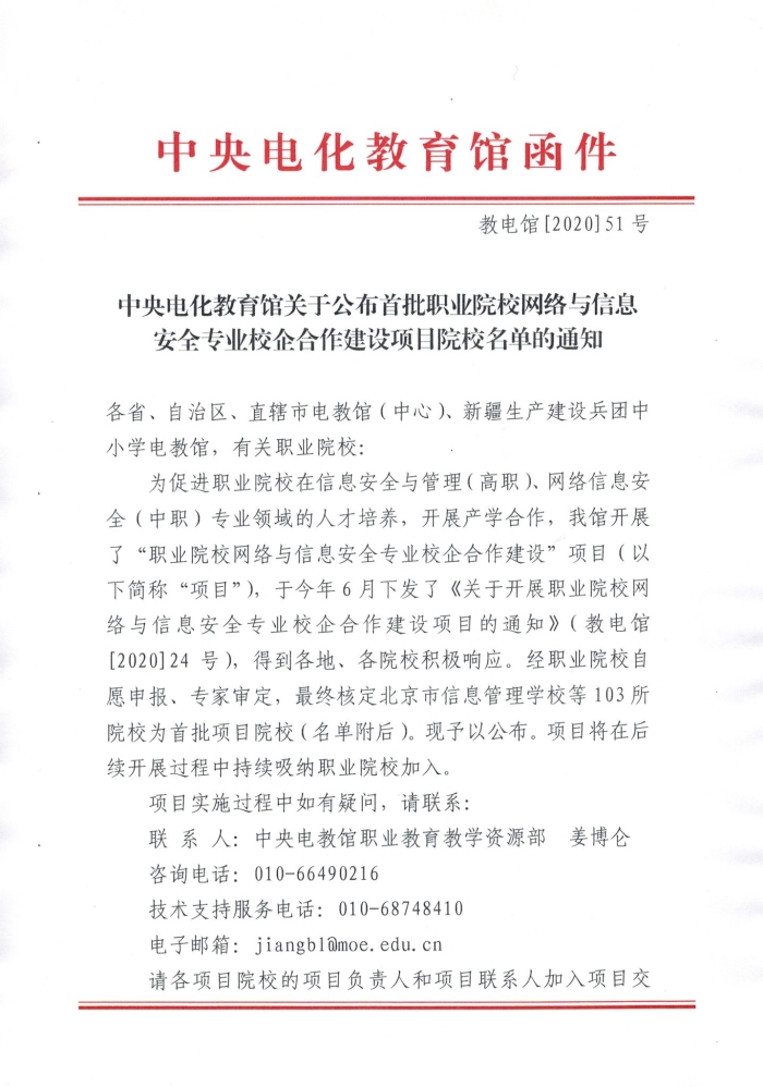 为促进职业院校在信息安全与管理(高职)、网络信息安全(中职)专业领域的人才培养,开展产学合作,中央电化教育馆于今年6月开展了“职业院校网络与信息安全专业校企合作建设”项目,我校积极组织进申报,并顺利通过审核获批。