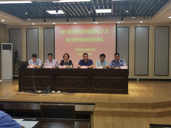 为加快推进我院高质量发展,发挥我院安全技术类专业的特色和优势,为地方经济助力发展与保驾护航,安全工程系积极开拓针对县区安检人员的能力提升工作。2020年8月2日,睢宁县开发区安监局首期执法人员能力提升培训班在我院云龙校区开班。学院副院长李桂萍、睢宁开发区安监局局长邢剑出席并讲话,开班仪式由安全工程系主任李志浩主持,安全工程系副主任王浩、马岩岩参加了开班典礼。