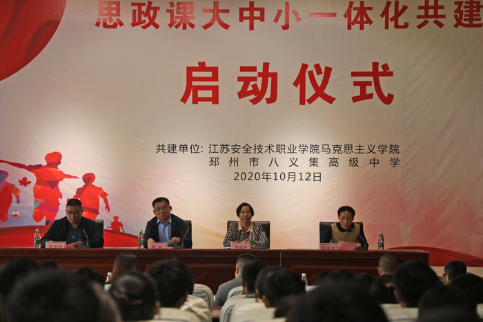 10月12日,江苏安全技术职业学院马克思主义学院与邳州市八义集高级中学思政课手拉手共建启动仪式在八义集高级中学举行。江苏安全技术职业学院副院长李桂萍,邳州市教育局局长李岩、副局长侯书芳,八义集高级中学校长耿长松等出席启动仪式。