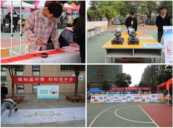 交通与安全学院为新生准备了毛笔书写的入学纪念,电气工程学院展示了智能机器人。各二级学院的展板处介绍了学院的办学历史、办学成绩、优秀社团、学生组织。各学院的志愿者们为本专业的新生提供了热情周到的服务。学生餐厅挂出了“创建节约型校园 从珍惜每一粒粮食开始”的横幅,向全体新生发出倡议,杜绝“舌尖上的浪费”。