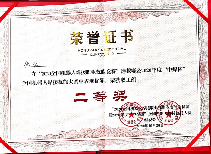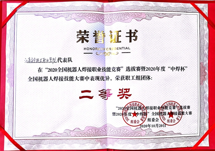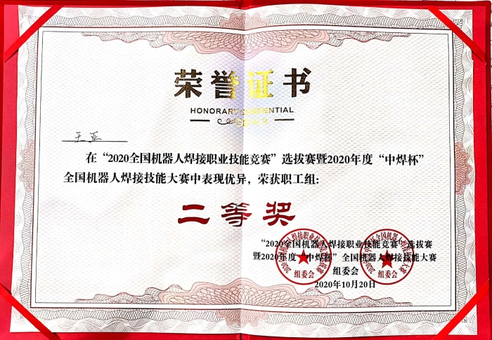 10月17-20日举办的2020年全国机器人焊接技能大赛暨机械行业职业教育技能大赛——机器人焊接赛项在山东奥太有限公司闭幕,我院参加此项比赛并取得优异成绩,机械工程学院师生两个参赛队荣获团体一银一铜。王亚、张波老师荣获职工组团体二等奖,其中王亚在机器人焊接实操中荣获二等奖,张波在机器人焊接实操荣获二等奖(职工组二等奖第二名);渠立兴、孟子博学生组荣获团体三等奖,其中渠立兴在机器人焊接实操中荣获三等奖。
