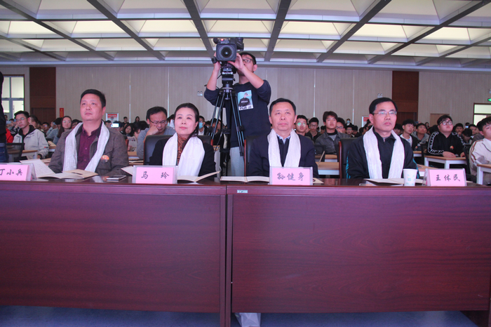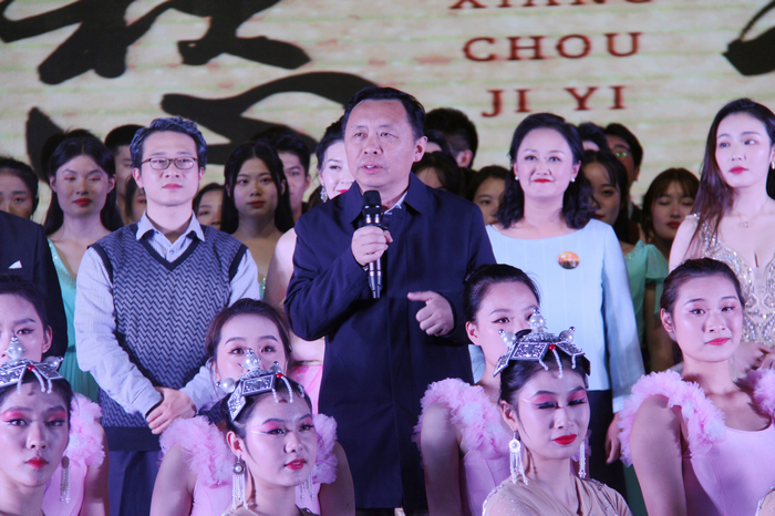 演出的最后,我院党委副书记孙健身受邀上台讲话。在讲话中,孙健身首先感谢了徐州幼专大学生艺术团的老师和同学们为我院师生带来了一场精彩的演出,他讲到,这场演出以诗歌和歌舞的形式,串联起了各个不同时代的声音,唤醒了记忆,唤醒了乡愁,唤起了对于家乡的回忆,是一场精彩的文化盛宴,演职人员用心的创作与编排给在场的观众带来了一场精彩的视听享受。演出结束后,领导嘉宾走上舞台与演出人员合影留念。