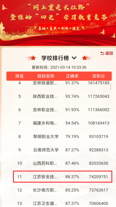 通过广泛的动员以及全院师生的共同努力,截止目前我院在系统中的总积分为74209751分,位列全国高校第11名,江苏高校中排名第1。在后续的学习教育活动中,全院师生将上下一心,更加积极参加竞答等各类主题教育活动,更好的提高主题教育活动的效果。(学工处)