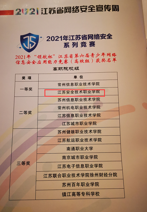 江苏省第六届青少年网络信息安全应用能力竞赛由江苏省委网信办、省教育厅、省人社厅、省公安厅主办,该赛项共设置一等奖2名,二等奖4名,三等奖6名,获奖队伍队员将录入到江苏省信息安全人才库。