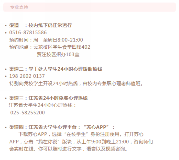 开展浸润式心理健康教育活动,构筑“保健”防线。省24小时心理热线和苏心App、学校24小时心理热线,帮助学生科学应对心理困扰。自开通之日起,累计接线100人次;借助“苏安学工”公众号,进行疫情防控期间心理科普和自助知识的宣传;借助“3.20”心理健康周开展“向阳携行,共创未来”心理健康教育系列主题活动,通过寻找最美校园、幸福打卡、运动打卡、心理健康主题讲座等十余项寓教于乐的活动,打卡人数超过1000人,心理讲座参与人数达到3000余人,引导大学生关注自我心理健康,增强心理保健意识;充分利用线上课堂教学主渠道作用,加大普及心理知识,培养大学生心理素质,为后疫情时代心理账户储值;利用学生干部体系,调动学生积极性、主动性,充分发挥朋辈互助作用,增强大学生自我教育、自我管理、自我服务能力。